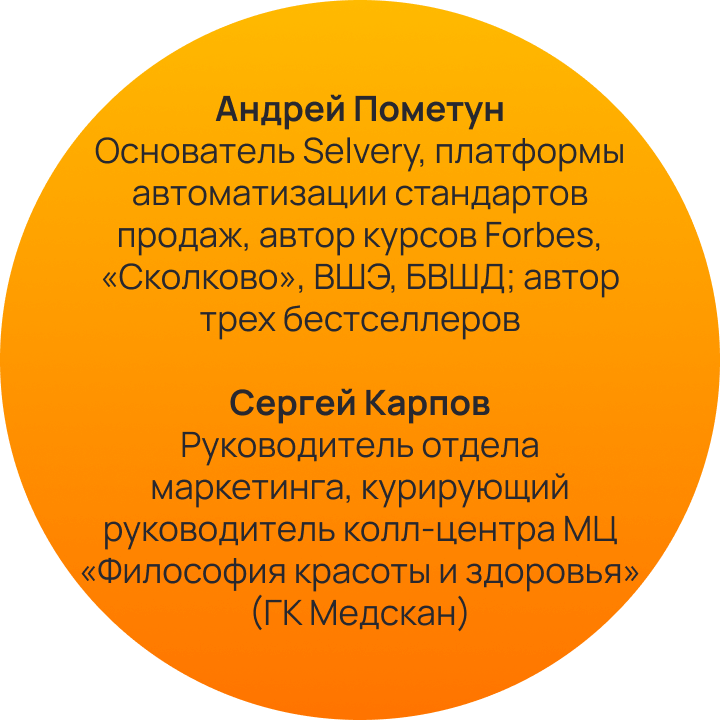 Андрей Пометун, Основатель Selvery, платформы автоматизации стандартов продаж, автор курсов Forbes, «Сколково», ВШЭ, БВШД; автор трех бестселлеров | Сергей Карпов, Руководитель отдела маркетинга, курирующий руководитель колл-центра МЦ «Философия красоты и здоровья» (ГК Медскан) |