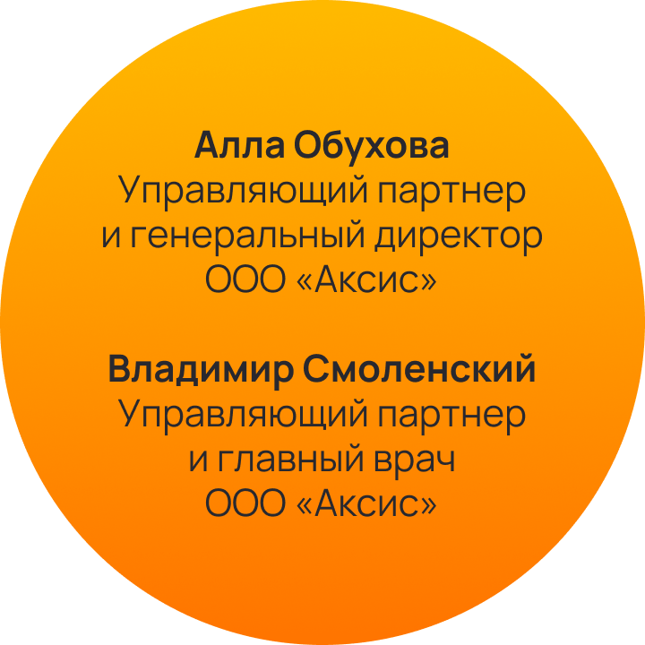 Алла Обухова, Управляющий партнер и генеральный директор ООО «Аксис» | Владимир Смоленский, Управляющий партнер и главный врач ООО «Аксис» |