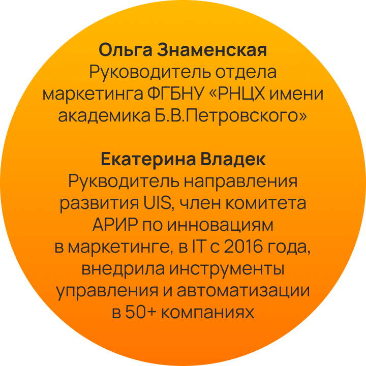 Екатерина Владек, Рукводитель направления развития UIS, член комитета АРИР по инновациям в маркетинге, в IT с 2016 года, внедрила инструменты управления и автоматизации в 50+ компаниях | Ольга Знаменская, Руководитель отдела маркетинга ФГБНУ «РНЦХ имени академика Б.В.Петровского» |