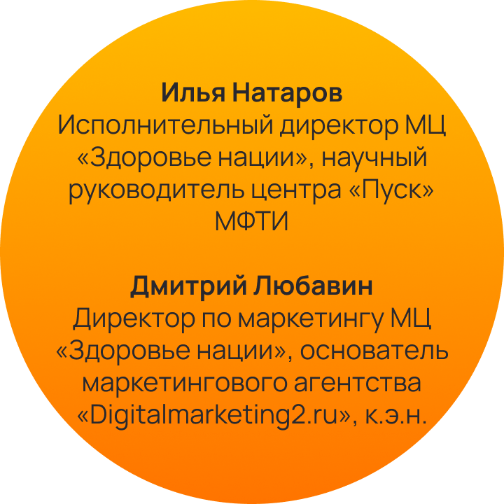 Илья Натаров, Исполнительный директор МЦ «Здоровье нации», научный руководитель центра «Пуск» МФТИ | Дмитрий Любавин, Директор по маркетингу МЦ «Здоровье нации», основатель маркетингового агентства «Digitalmarketing2.ru», к.э.н. |