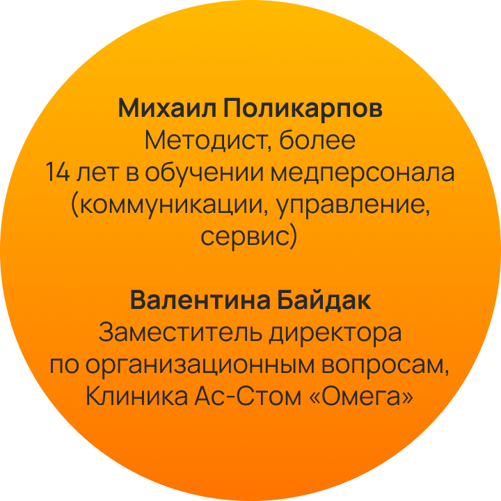 Михаил Поликарпов, Методист, более 14 лет в обучении медперсонала (коммуникации, управление, сервис) | Валентина Байдак, Заместитель директора по организационным вопросам, Клиника Ас-Стом «Омега» |