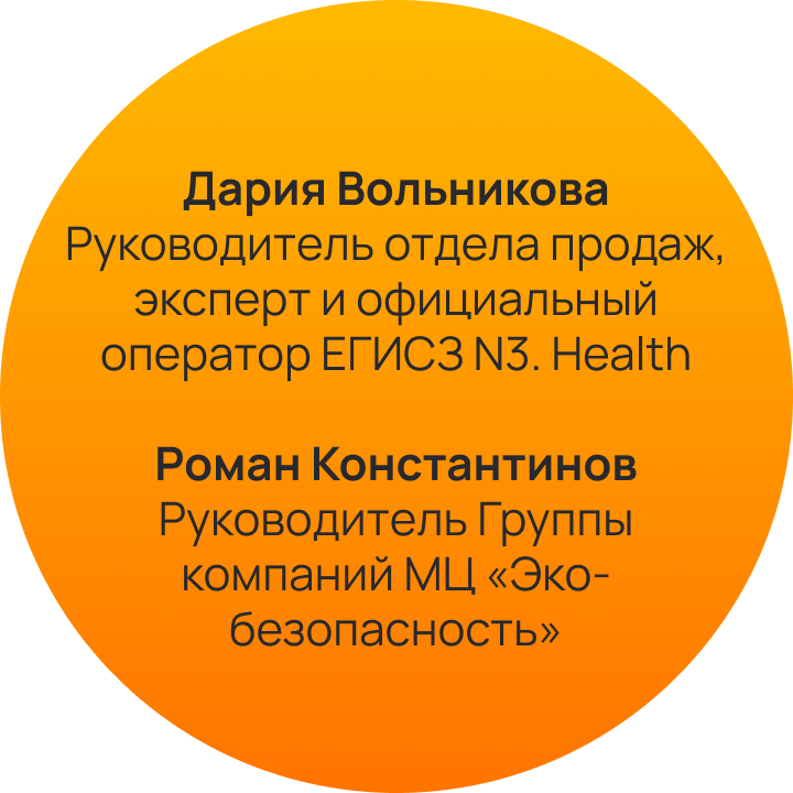 Дария Вольникова, Руководитель отдела продаж, эксперт и официальный оператор ЕГИСЗ N3. Health | Роман Константинов, Руководитель Группы компаний МЦ «Эко-безопасность» |