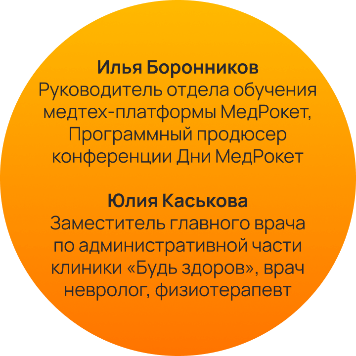 Илья Боронников, Руководитель отдела обучения медтех-платформы МедРокет, Программный продюсер конференции Дни МедРокет | Юлия Каськова, Заместитель главного врача по административной части клиники «Будь здоров», врач невролог, физиотерапевт |