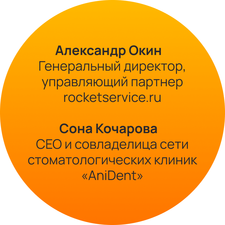 Александр Окин, Генеральный директор, управляющий партнер rocketservice.ru | Сона Кочарова, CEO и совладелица сети стоматологических клиник «AniDent» |