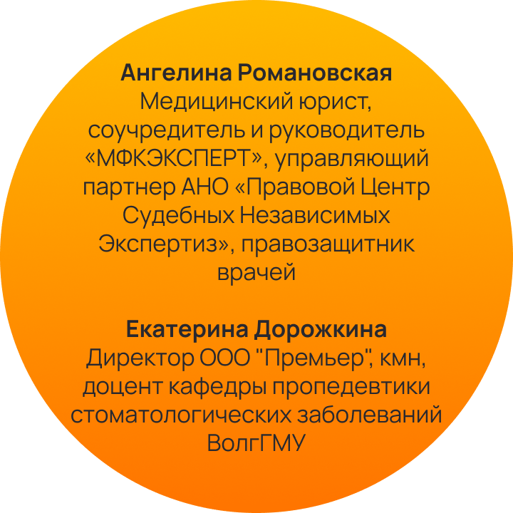 Ангелина Романовская, Медицинский юрист, соучредитель и руководитель «МФКЭКСПЕРТ», управляющий партнер АНО «Правовой Центр Судебных Независимых Экспертиз», правозащитник врачей | Екатерина Дорожкина, Директор ООО «Премьер», кмн, доцент кафедры пропедевтики стоматологических заболеваний ВолгГМУ |