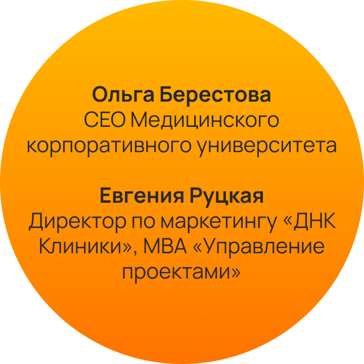 Ольга Берестова, СЕО Медицинского корпоративного университета | Евгения Руцкая, Директор по маркетингу «ДНК Клиники», МВА «Управление проектами» |