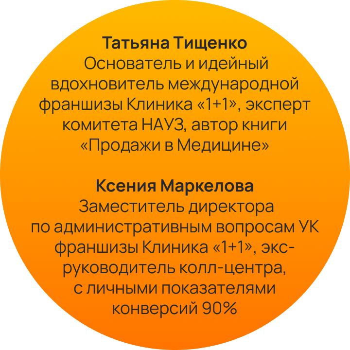 Татьяна Тищенко, Основатель и идейный вдохновитель международной франшизы Клиника «1+1», эксперт комитета НАУЗ, автор книги «Продажи в Медицине» | Ксения Маркелова, Заместитель директора по административным вопросам УК франшизы Клиника «1+1», экс-руководитель колл-центра, с личными показателями конверсий 90% |