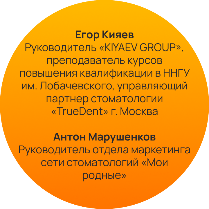 Егор Кияев, Руководитель «KIYAEV GROUP», преподаватель курсов повышения квалификации в ННГУ им. Лобачевского, управляющий партнер стоматологии «TrueDent» г. Москва | Антон Марушенков, Руководитель отдела маркетинга сети стоматологий «Мои родные» |