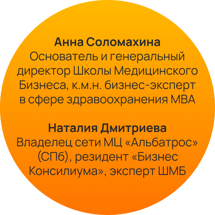 Анна Соломахина, Основатель и генеральный директор Школы Медицинского Бизнеса, к.м.н. бизнес-эксперт в сфере здравоохранения МВА | Наталия Дмитриева, Владелец сети МЦ «Альбатрос» (СПб), резидент «Бизнес Консилиума», эксперт ШМБ |
