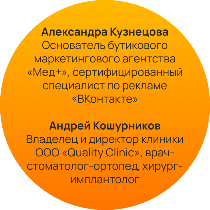 Александра Кузнецова, Основатель бутикового маркетингового агентства «Мед+», сертифицированный специалист по рекламе «ВКонтакте» | Андрей Кошурников, Владелец и директор клиники ООО «Quality Clinic», врач-стоматолог-ортопед, хирург-имплантолог |