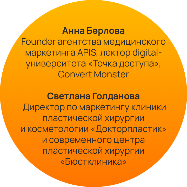 Анна Берлова, Founder агентства медицинского маркетинга APIS, лектор digital-университета «Точка доступа», Convert Monster | Светлана Голданова, Директор по маркетингу клиники пластической хирургии и косметологии «Докторпластик» и современного центра пластической хирургии «Бюстклиника» |